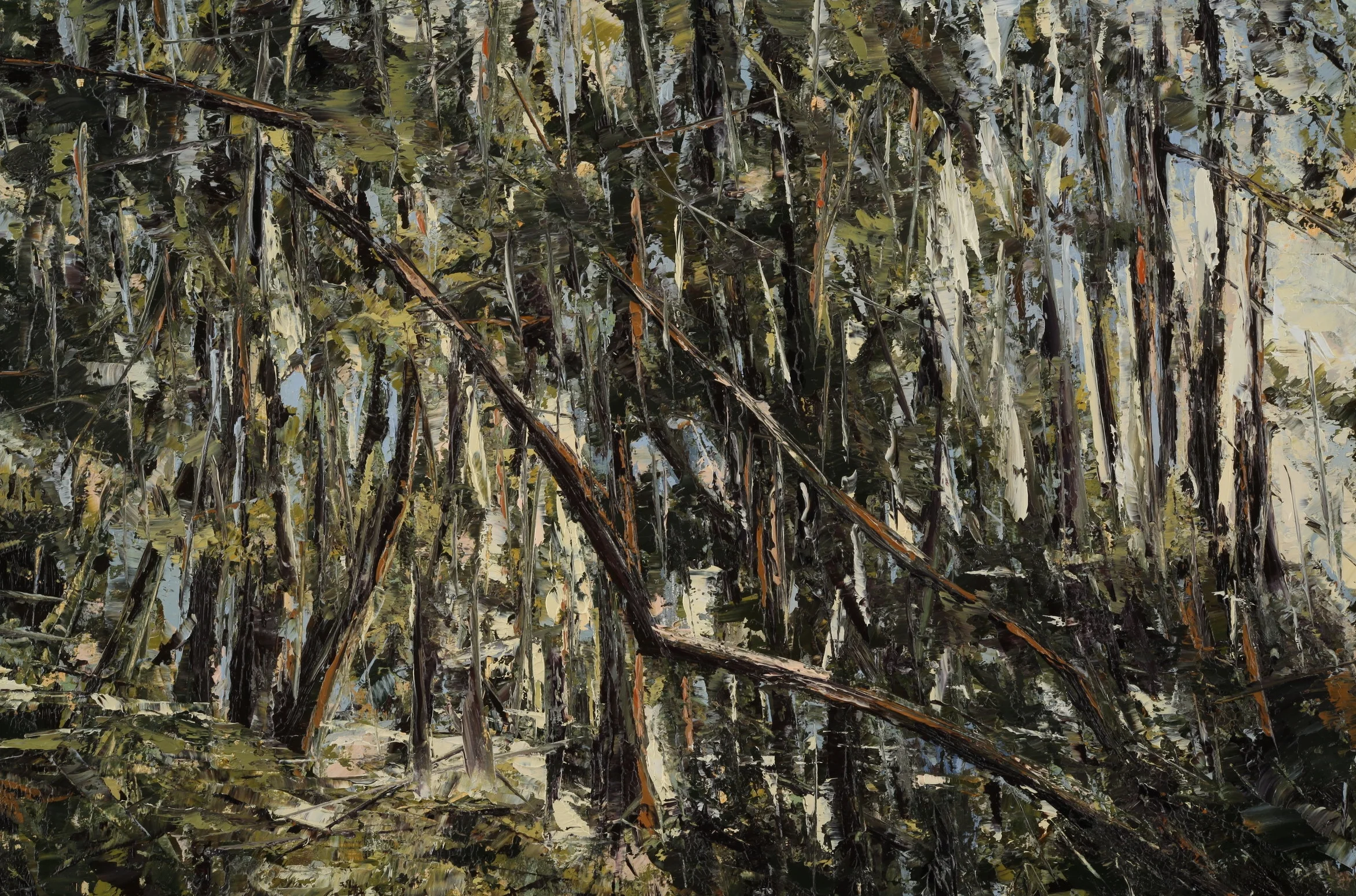 I begin my paintings by referencing small studies made in nature as well as photographs to keep within the parameters of reality. I work liberally with oil or acrylic paint, often using palette knives to build up the surface of the canvas or panel. As I paint, I am constantly reassessing my intentions and actions. By deliberately re-working the surface, my hope is to unearth the more intrinsic concerns within the painting.